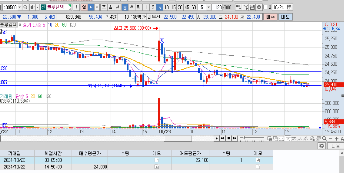 일단 대장주 매매는 기사까지 오전에 나온 상태였기 때문에 조금씩 사보는 것 좋았을 것 같다. 23일 장전 기사나오고 장 후 상승해서 끝까지 상승했다. 오늘(24일)도 상승중이다.