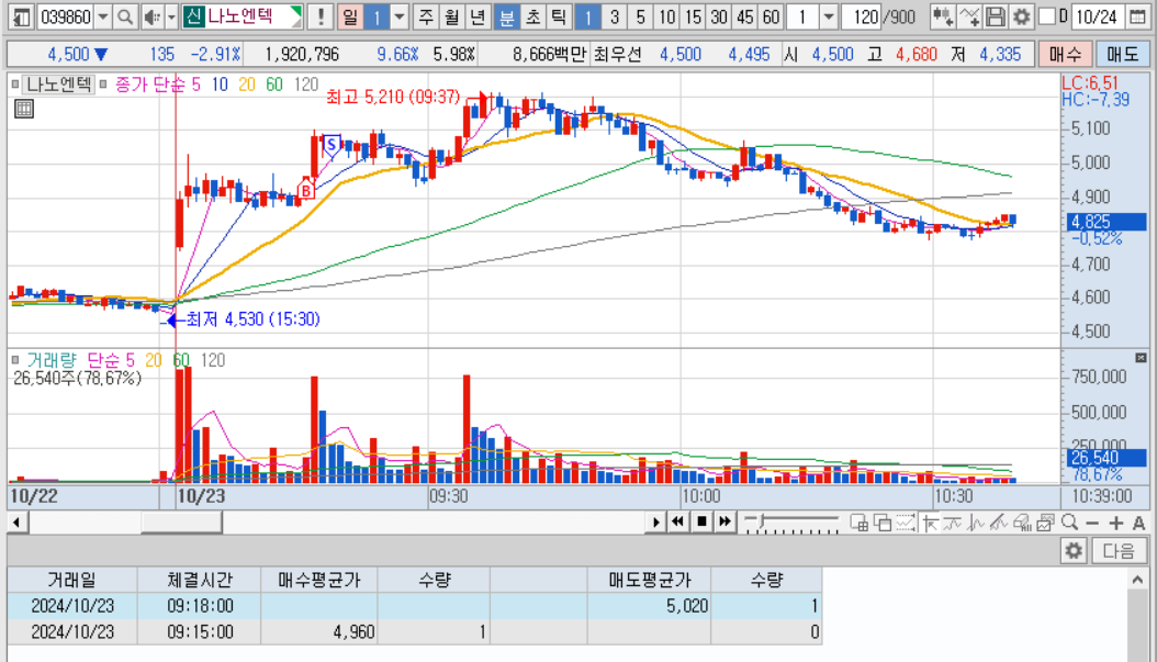 나노엔텍은 비만 관련주인데 이때 아직 비만주가 안 끝난 것 같아서 매매해보았다. 딱히 다른 기사는 없었고, 일봉보고 산 날이 바로 직전 파란 음봉인데 빨간 장대양봉 뜨고 거래량 줄고 지지선에서 멈춘 것 같길래 다음날 또 크게 양봉이 나와줄 줄 알았다. 그치만 3번째 시도여서 아직 안터져준 것 같다. 이건 1번터지고 2,3번째에서만 시도해야겠다. 3번까지 장대양봉 나오면 하지 말자.