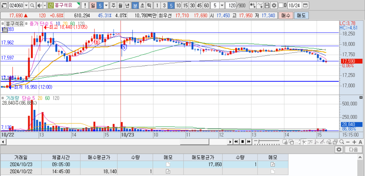 석유값이 올랐다는 기사보고 흥구석유가 대장주가 될 것 같아서 구매했다. 종베로 샀다. 산 가격은 그 쯤이 저항가격이라고 판단을 해서 샀어야했다. 아래도 20일선즈음 지지 받는거 확인을 조금 기다려봤어야했다. 3% 까지는 기다렸다가 지지 못받는걸 확인하면 팔았어야했는데 성급했던 것 같다. 아니면 저항선 근처에서 종베하는 게 아니라 다음날 그냥 아침을 기다리는 게 맞았던 것 같다.
