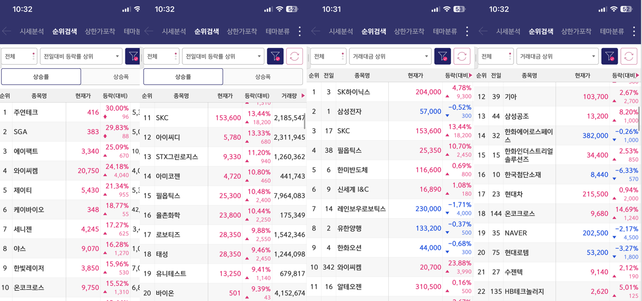 주연테크(양자컴 관련주?), SGA, 와이씨켐(유리기판), 스타코링크, 에이팩트(반도체,삼전DDR), 케이바이오(바이오), 야스(유리기판), 세니젠(바이오), STX그린로지스(해운), 기가비스(유리기판), SKC(유리기판), 아이씨디(유리기판), 흥아해운(해운), 태성(유리기판), 필옵틱스(유리기판), 메타케어(바이오), SGA솔루션즈, 에프앤에스테크, 인베니아, 삼성공조(액침냉각) .
